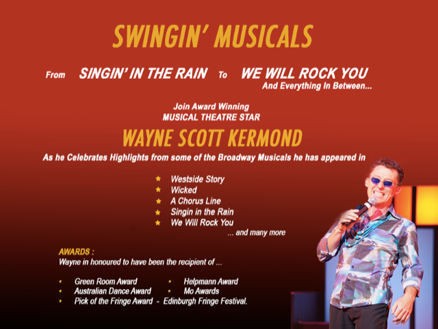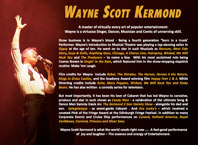 A master of virtually every art of popular entertainment: Wayne Scott Kermond is a virtuoso Singer, Dancer, Musician and Comic of unnerving skill.