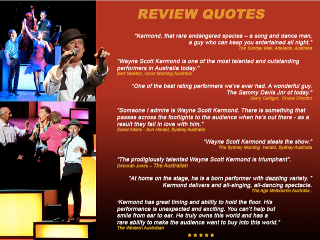 “A born performer he is at home on the stage. Kermond delivers and all-singing, all-dancing spectacle – Dazzling variety” The Age Melbourne